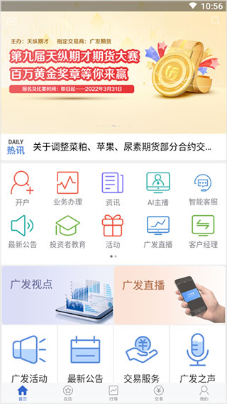 1、首页功能模块,这里用户可以进行开户、业务办理、查看资讯等等;