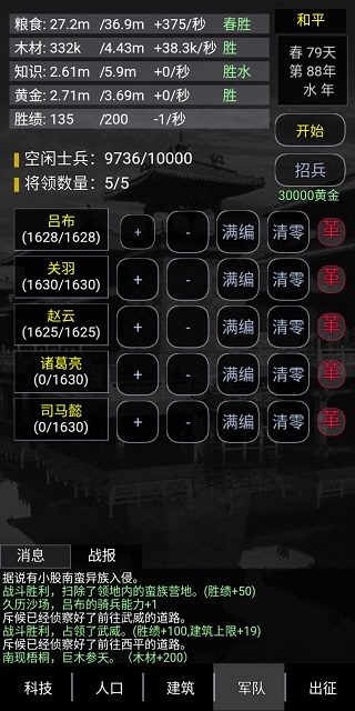 3、同步进行的模式,包括各个建筑的升级打造,还有士兵和将领的招募训练。