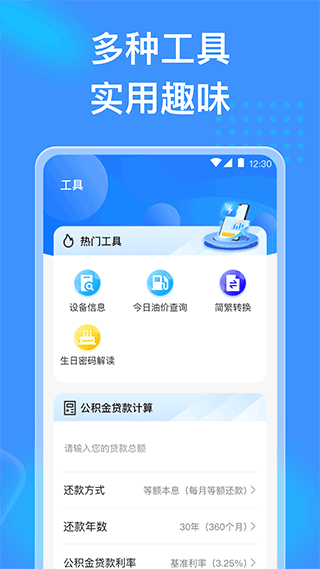 【生活工具】还有各种便民工具供您使用:查询油价、公积金贷款计算、生日密码解读以及文字简繁转换,增添生活便利性。