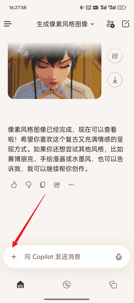 1、打开Microsoft Copilot应用,点击界面右下角的“+”按钮,进入创建页面。