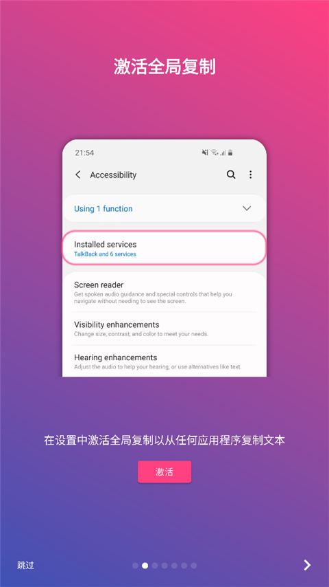点击下面的“打开设置"按钮,或转到“设置”/“无障碍”/“全局复制”,将其先关闭再打开这会启动/重新启动服务,您将看到通知有时安卓系统(尤其是三星设备上)会自动终止无障碍服务,因此您必须手动重新启动它。