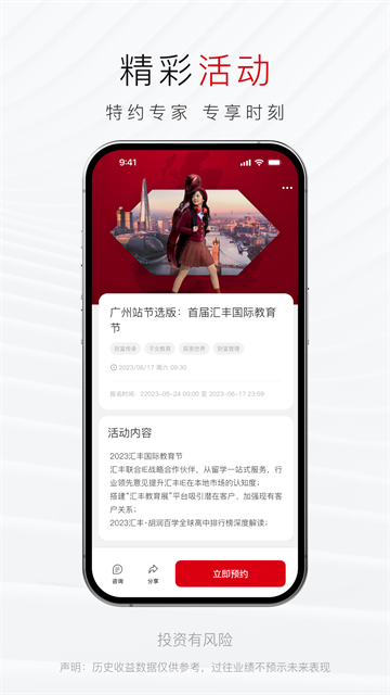 汇丰汇选App是一款财富管理学习软件。在这里你可以在线学习具体的理财知识以及相应的操作,也可以看到最新的财经资讯,了解财经动向,更可以自己真实进行投资,理财赚钱。同时,软件内含各种实用工具,其中包含学费查询、个税查询、保单扫描、医疗费用查询等7类家庭保障类工具,和基金筛选器、财经日历、基金知识图谱等财富规划工具,以及癌症测试、睡眠测试、气色测试、运动测试等健康风险干预工具,全方面守护用户家庭身心财产安全,陪伴用户共同成长,实现家庭承诺,帮助用户解决管理财富前最后一公里的问题。理财之前,上汇选。