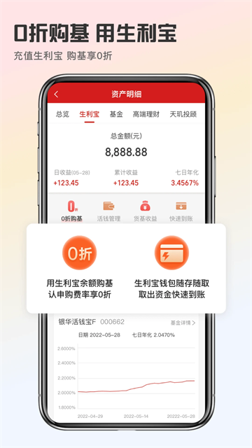 银华生利宝App是银华基金推出的理财平台,功能挺齐全的,可以查基金、买基金,还有专业的团队帮忙配置资产。最吸引我的是申购基金还能免手续费,这个福利挺不错的。软件里还有“四笔钱理财”这种简单易懂的投资方法,适合像我这样对理财不太熟悉的人。另外,“净值早更新”和“购基享0折”这些小细节也做得很好,感觉用起来很贴心。