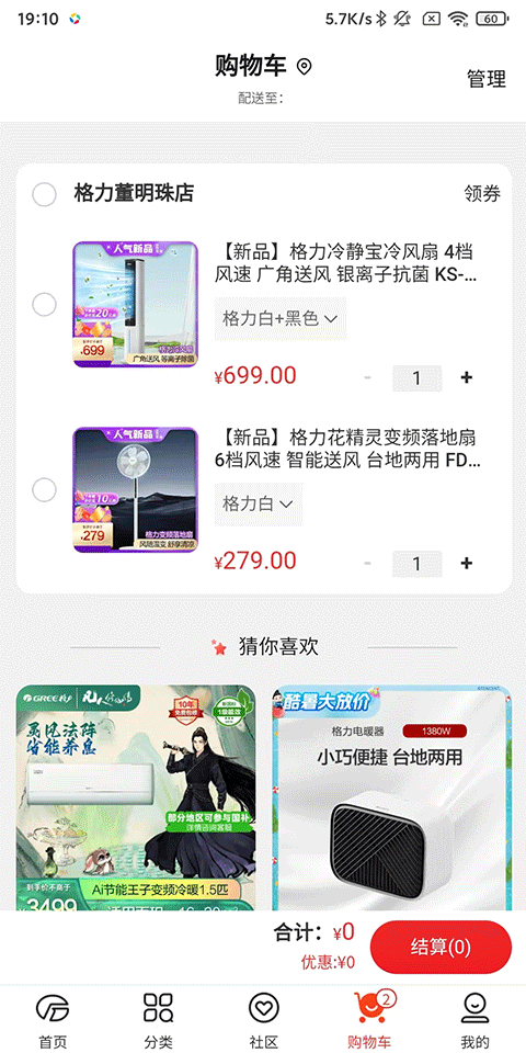 软件特色包括闪电配送、官方站点品质放心、积分好礼和会员特权等。分类细致,涵盖家用商用空调、冰箱冰柜、洗衣机等多种产品。社区功能丰富,用户可以分享购物体验和家电知识。购物车支持优惠券结算,我的页面方便管理订单和收藏。