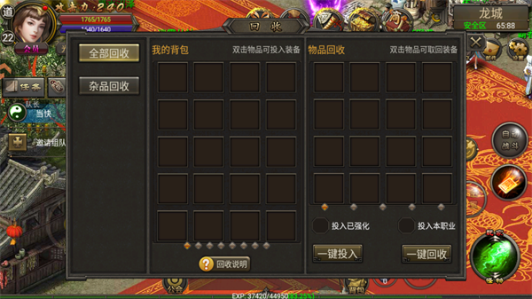 5、随着等级提升,低级装备可回收换取大量经验。每次击杀怪物后,不管装备等级高低,都捡起来,攒满背包后到龙城装备回收员处回收。