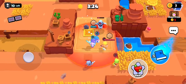 gameplay方面,打开游戏后系统会自动匹配对手,玩家可以选择三个角色出战,操作方式是左边移动右边攻击或释放技能,技能满了就可以放技能打敌人,最后比拼击杀数决定胜负。除了对战模式,还有宝石狩猎和矿rush等任务模式,可以和其他队伍竞争资源。