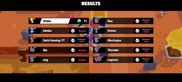 和一个朋友组队对抗其它三个队伍。收集到最多宝石的队伍获胜。获胜队伍分享战利品,失败也能得到。有任务、表情、皮肤、5v5、排名模式。所有角色都有特殊技能。