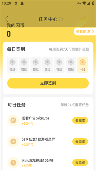 3、签到、完成每日任务获得闪币