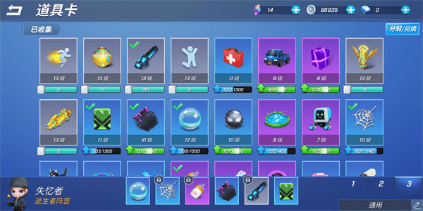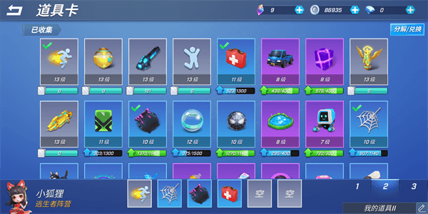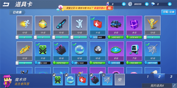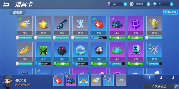 1、道具卡携带:医疗箱(回血,一次救多人,建议锁定)、跳高(逃禁闭室用的,建议放在前面,不然难逃禁闭)、疾跑(速度快,不会因为受攻击打断,最重要的是花费少)、火箭筒(打追捕用的,没事来上一两炮,还有击退效果)、手雷(给对面的迟钝剂,可以造成减速和无法攻击)、皮卡(跑的贼快,逃命时用的,没事还能拉人),以上是新手建议带的卡组,不一定要用,可以自己调整。