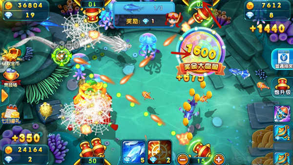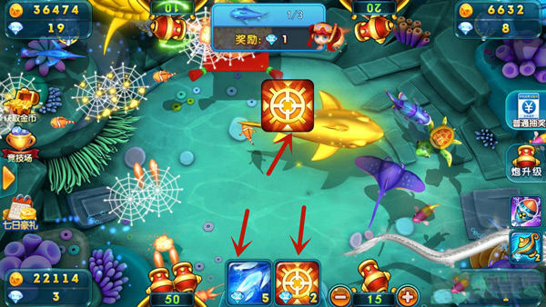 升级炮台能提高捕鱼的杀伤力,攻打大鱼和远处的鱼时必须要使用大炮,如果炮弹不足,是无法捕捉成功的,因此还需要升级炮弹的倍数,倍数越高,冲击力越大。升级炮台需要消耗一定的钻石,钻石如果不够可以在游戏中升级赢得钻石或者去商城购买。
