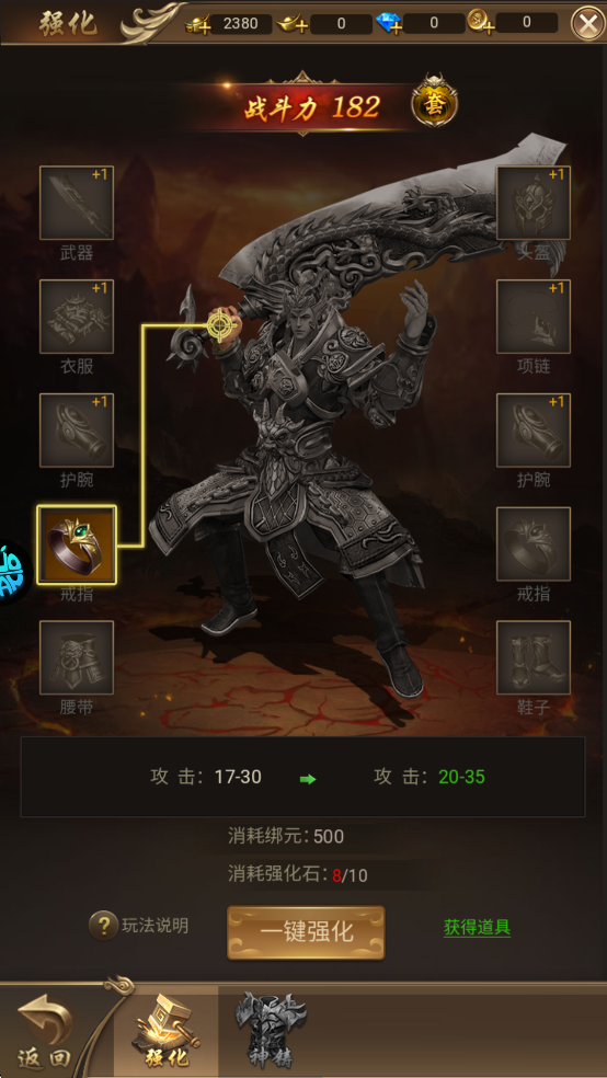 通过使用强化石强化装备后,角色的战力会大幅提升