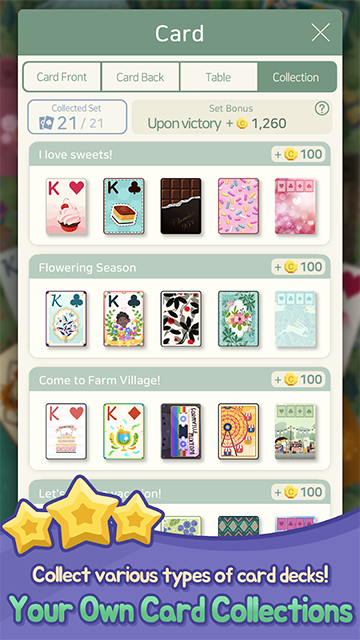 农场的建设可以通过四种纸牌游戏来获得金币,每次在游戏中获胜后,玩家都会收到主线任务提供的金币奖励。关于玩法,成功完成连击或多个挑战任务后,你将获得星星,收集星星和卡叠可以用来购买各种商品。此外,在卡牌游戏中获得胜利后,还能设计出不同风格的农场,打造独特的农场景观。