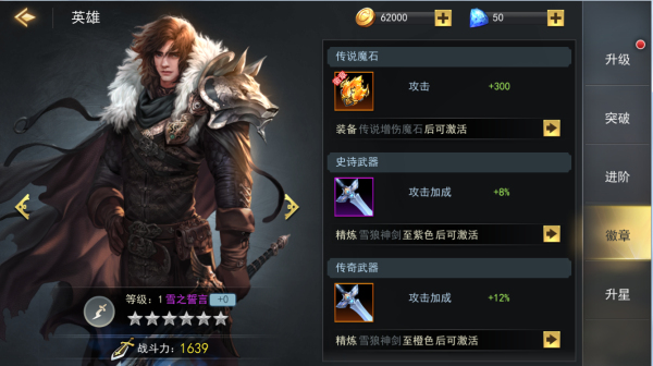 以雪之誓言为例,他的第一枚徽章激活条件是:佩戴一颗传说增伤魔石,玩家只需达到14级就可以装备魔石,佩戴指定魔石后,雪之誓言除了可以得到魔石本身的属性加成,还将获得徽章带来的300攻击力加成。