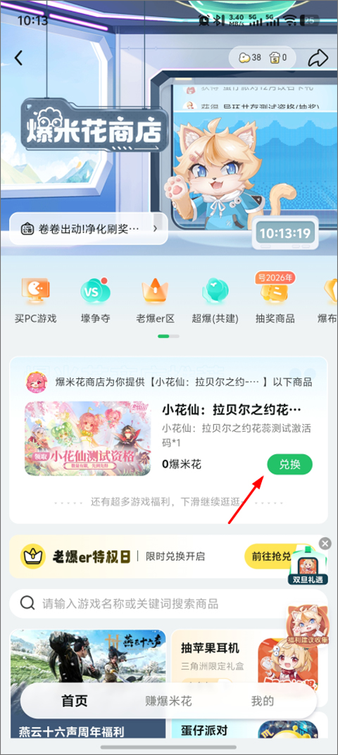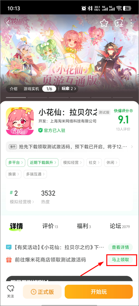 1、打开好游快爆,进入后搜索小花仙拉贝尔之约,找到领取测试激活码,点击马上领取;