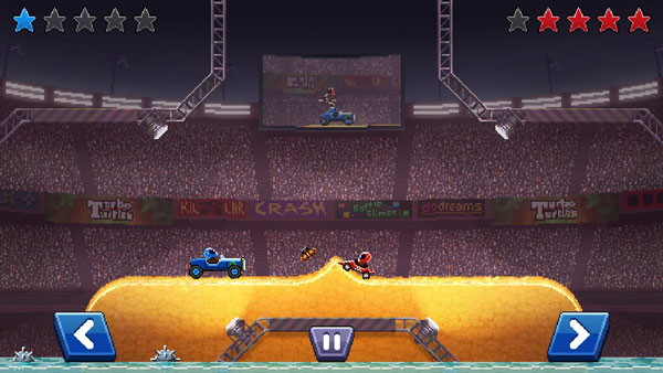 撞头赛车是一款横版的像素风休闲游戏,同时也是一款相当具有暴力的休闲娱乐性游戏,游戏中玩家将驾驶各种不同的车型与对手展开1V1的较量,目标是撞击到对方车头,而获胜的方法很简单,那就是纯撞,不管你是直接用轮子糊对方车头,还是用场地的机关电锯把对方车头切成两半,只要系统判定一方的车头受伤,游戏就分出胜负了,即可得到1个积分,优先获得积分全满的一方将胜出。其次,撞头赛车颠覆了小编我对传统像素游戏物理表现的刻板印象,游戏内不仅有出色的物理碰撞,还有各种物理翻转、重力、加速,拆分、乃至部位碰撞都设计的有声有色,为的就是能够给予玩家更为刺激,更加真实的模拟游戏环境。与此同时,游戏中还有各种各样的赛车款式和多元化的挑战模式,来丰富玩家们的休闲生活,激情对决,一切都从这里开始,现在就叫上你的好友,一起来一局吧!