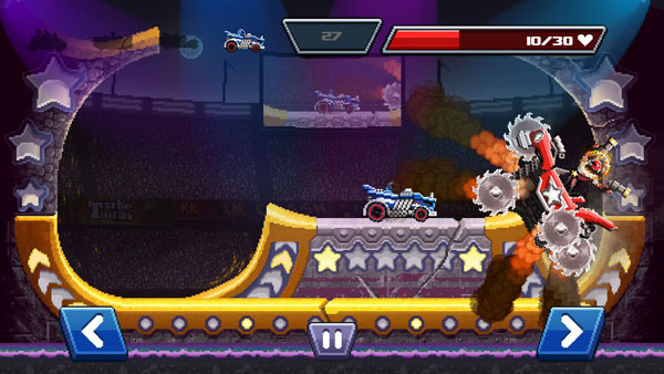 操作上,《撞头赛车》的按键是固定的,且只提供了左右的方向键控制相应移动,看似简单的操作实际上并不轻松,因为游戏中的车型并没有看上去的笨重,实际操作起来有些“飘”,左右移动速度过快的情况下会出现重心偏移的状况。相对的,我们也可以充分利用这点来翘起自己的前轮,更利于战斗。等下……这种翘起前轮向下压敌人的战斗方式怎么似曾相识呢?(某巨无霸)