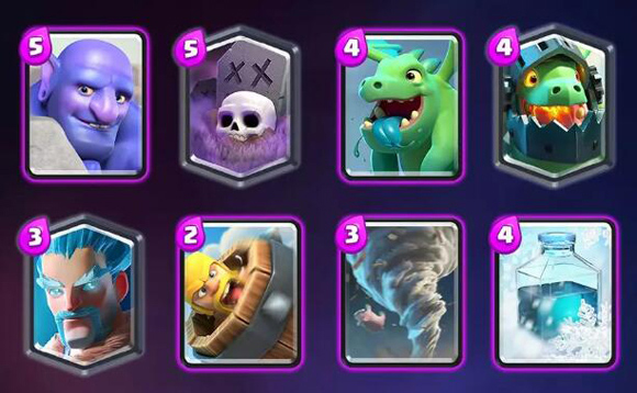 卡组搭配:骷髅军团+哥布林飞桶+飞龙宝宝+野蛮人滚桶+哥布林小屋+火球+骷髅墓碑+猎人,平均消耗圣水3.5。