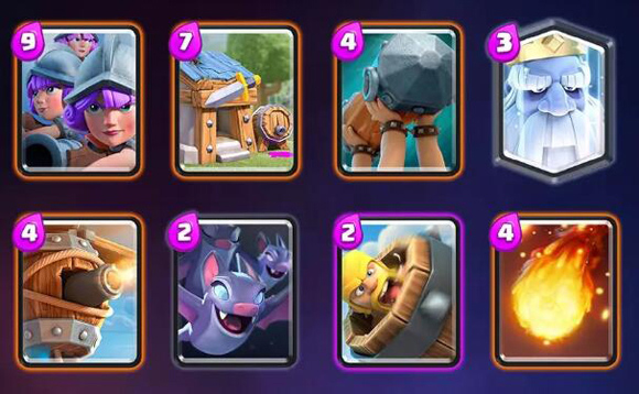 推荐原因:圣水消耗量少,有攻有防,如果对面选择的是高耗率卡牌的话,完全可以打他一个措手不及,并且卡牌容易集齐。缺点是,容易被女武神这种英雄压制,并且生命力低。