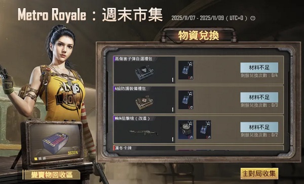 11月7日-11月9日期间,在地铁逃生中收集指定变卖品可在市集兑换奖励,活动期间会高价回收一定数量的指定变卖物品,回收区每24小时更新!