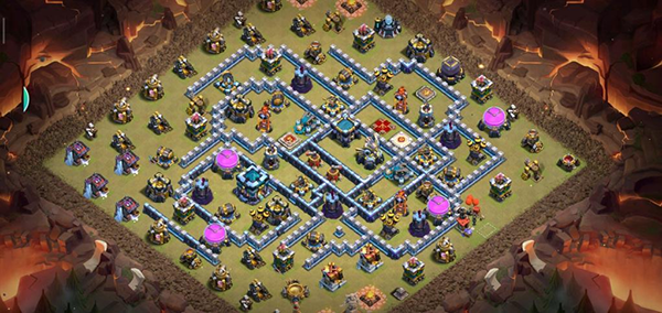 阵型解析:这是一个大本偏置的不规则格子阵,呈菱形的放置方法,大本与中心区域隔开放置。这种格局是一种比较常见的防守放置,对于陆军来说是需要弹跳或者地震才能穿透这个阵型的。火塔处均分散开,其中埋5电塔防止清边和引导部队走偏,也可以坑人。实测非常好用,适用于一般的部落战。