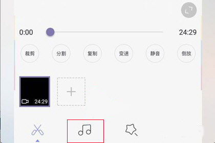 2、接下来我们就可以对添加的视频进行编辑了,通过点击底端的音乐按钮打开音乐便捷功能列表,在列表中我们选择“音乐”功能即可添加配乐了。