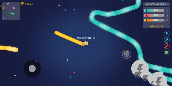 在熟悉了基本玩法后,就可以进行团战模式的玩法了。在团战模式中,小蛇的头部撞到同队(同色)的队友不会死亡。