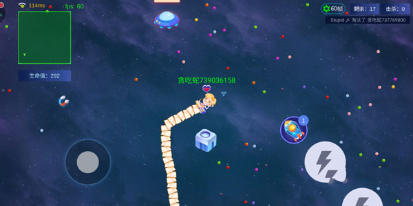 1、控制摇杆走位你的小蛇,吃掉地图上彩色的小圆点,就会变长哦。