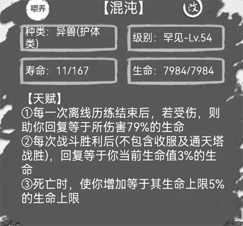 当你有混沌后,由于这货自带战斗回血的被动技能+胜利后系统自动回复灵宠25%的生命+自身8000血左右的恐怖血量。
