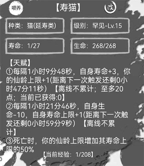 另外,前期的灵宠推荐二阶寿猫(罕见级别),这是所有五阶灵宠中唯一一个可以稳定得到寿命量正增长的灵宠