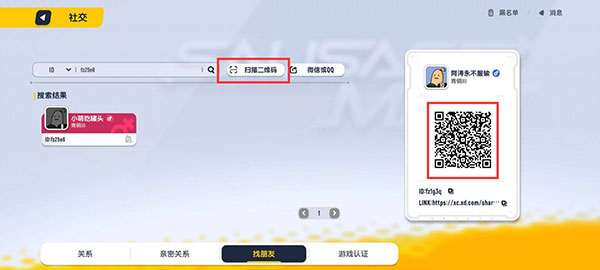 2、进入社交后在底栏选择找朋友,然后在搜索框输入id或者昵称点击搜索即可找到好友然后点击名片右小角的按钮进行添加