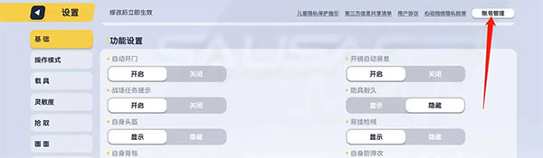 2、进入游戏设置后,在右上角打开账号管理。