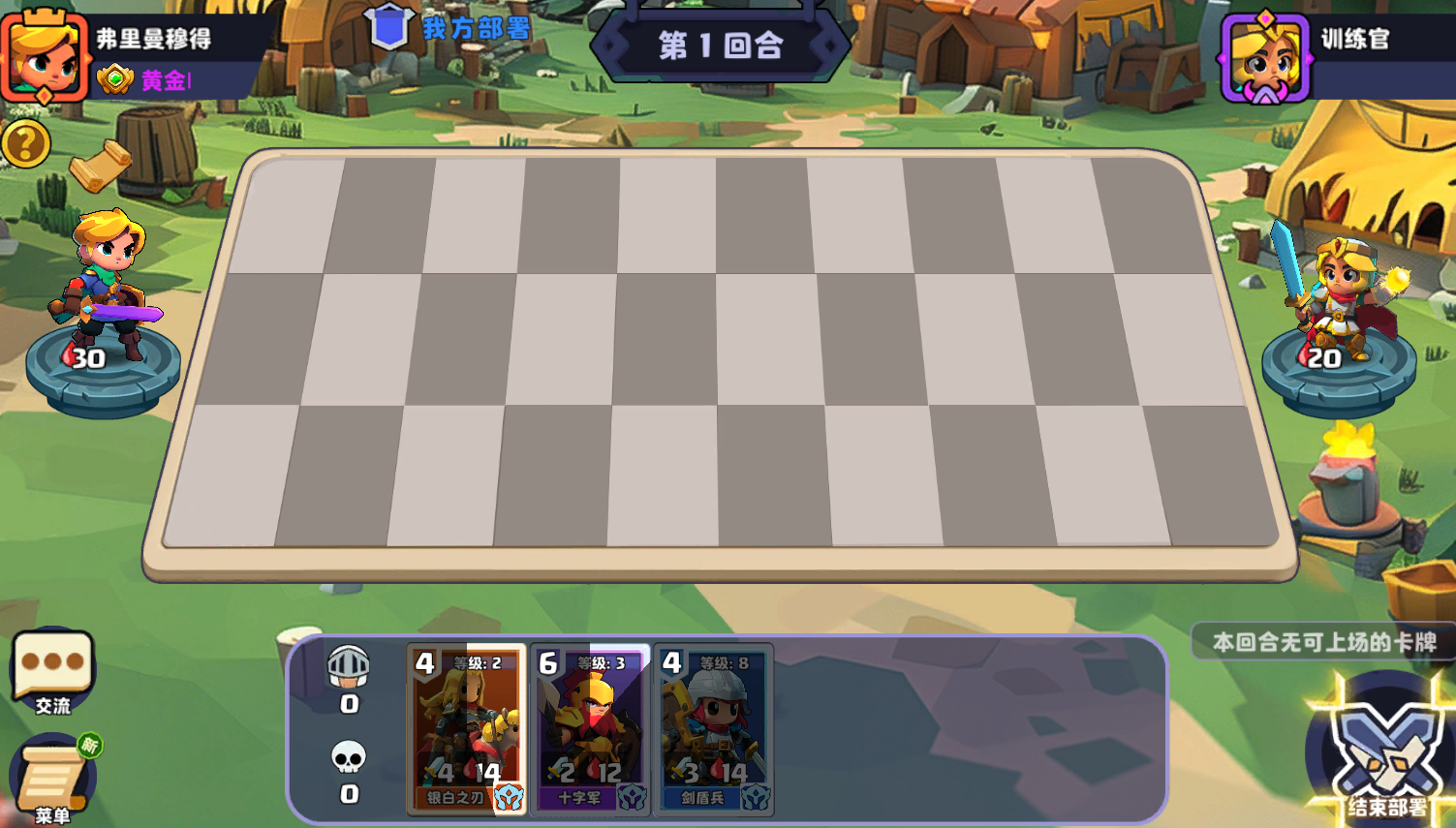 2、游戏采用三路回合制对战玩法,由图可见,上中下三条路我们都可以摆放随从,利用随从把对方角色的血量打空即可获得胜利,角色下方的小心心便是我们的血量值,当摆放结束时,点击右下角结束部署轮到对方回合。