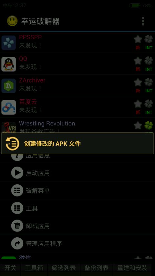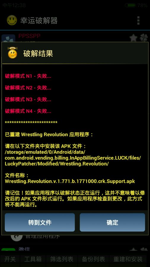 11、创建石皮解后的修改版APK并生成到/sdcard/LuckyPatcher/Modified/;