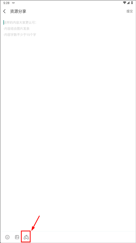 3、进入资源分享后,输入文字内容,然后点击下方“游戏手柄”图标;