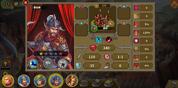 先说选将,将领是三技能,第一为主动,目前看有三大类:第一类为多重攻击可以攻击多人,炮兵基本是一炸一片,骑兵步兵都是打一直线,弓兵为多目标;第二类为恢复类,目前入手贞德实测一级的话基本就是几十的血根本没用;第三类为buff,个人觉得可以放弃。第二技能一般为攻击附加少数几个是降某种兵种的伤害,目前见到的有混乱、降士气、降攻击、降防御,还有两个nb技能,一个是勇猛升到最后可以让对方无法反击,还有一个bug技能后勤,满级后100%杀人回血12%,如果有个华盛顿扔到人堆里就是开了无双的状态,光靠反击就能清空一片,而且即使是一级在征服里触发概率也超高目前打前两个时代能保障霍去病和李世民的血量。