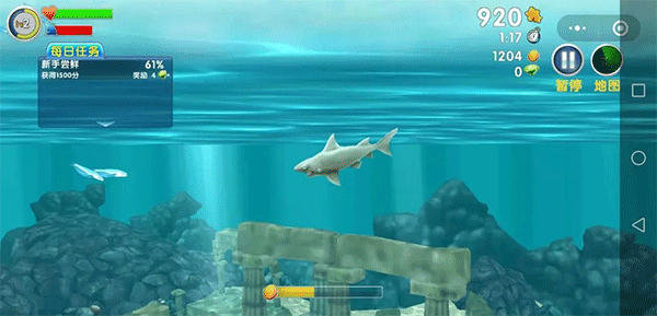 当然了,这种状态可遇不可求啊!不知道是不是我手机的问题,再加上鲨鱼目前等级比较低,在金币热潮时像个没头苍蝇一样,吃不到条鱼,因为速度慢,去深海里还没怎么吃金币热潮结束了,就惨兮兮的沦为其他大鲨鱼的点心。