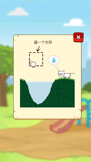 2、第二关:绘制一个物体,让其掉入到水里,从而让水面上升就可以让猫咪喝水了。
