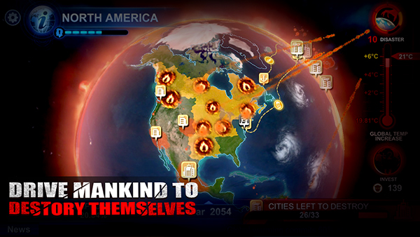 3、此时按照游戏中的目标,只需根据投资的产品进而升高全球的温度就能开始着手下一步的操作了,例如成功的将地球平均气温升高2度,继而引发大气中不稳定的因素。随着环境温室效应的升高,环境的不稳定,玩家将获得使用超级灾难的能力,灾难不仅能摧毁目标区域,也有机会传播到更多的区域产生连锁效应。