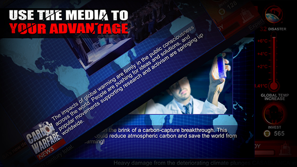 此外,在碳战争还有实时新闻信息的播报,玩家要根据其中的信息来合理分配投资资源,而游戏中囊括的投资项目有很多,玩家要抓取其中的关键,并有效的投入才能在较短的时间内,将二氧化碳数值提升,从而达到消灭地球的任务挑战。