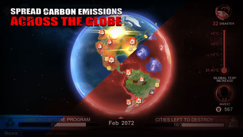 5、游戏的主场景正是我们生存的地球,温室效应愈发眼中而最终导致世界环境出现问题玩家扮演的角色则是加剧这一现象的推动者。你的任务就是提供二氧化碳的排量,加剧全球温室效应。而与玩家对抗的则是AI,它会做出相应的措施来阻止二氧化碳的排放,一场人机较量就此展开!