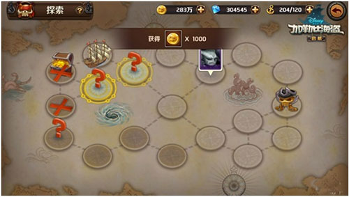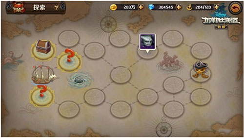 玩家从起点开始,通过点击相应位置前进。每次前进无法后退,且只能在有虚线航海线连接的地点间移动。每次前进一格触发随机事件