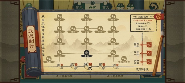 每个流派的政策对国家的影响都不同,比如儒家增加君王威望和教化,兵家增加训练效率,墨家增加建造速度等等,在不同阶段施行不同政策有利于国家更好的发展。