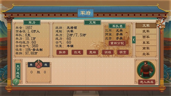 在战争中,军员的保证乃是重中之重,每一次扩编可在兵府-整编中扩编军队规模,训练提高军队士气,分配军队武器装备等,每次扩编都会消耗预备役。除了通过战斗中纳降,纳叛也可以获得兵卒,比起需要的士兵来说可谓是杯水车薪。如果不想做一个穷兵黩武的君主,还是老老实实大力发展内政吧。