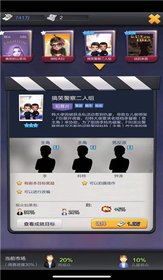 游戏提供海量剧本,涵盖爱情、动作、古装、喜剧等各种类型,从经典港片到好莱坞大片,应有尽有。玩家可以根据市场趋势和观众喜好,选择合适的剧本进行拍摄,体验从剧本创作到电影上映的全过程。