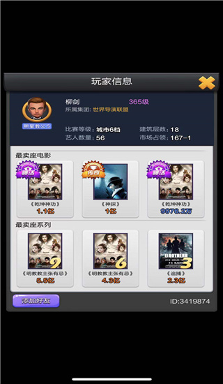 1、比赛排行:影片上映完之后,会出现我们的影片票房排行,在这里可以看到其他玩家的排行情况,有木有想努力冲上榜首的冲动。