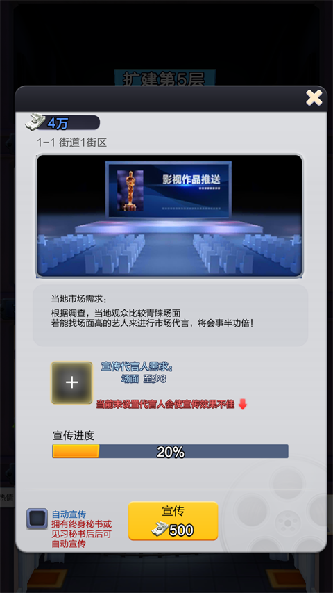 4、市场占领:经过一系列主线后我们会解锁市场功能,市场可以产出大量的金币和粉丝,派遣合适的艺人担任形象大使更会提高资源产量。越往后的城市产出资源越高,还有别忘了资源会有资源存储上限,记得偶尔上线领取一下。