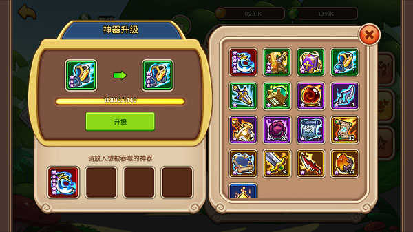 神器升级:可以消耗低品级神器为高品阶神器升级。