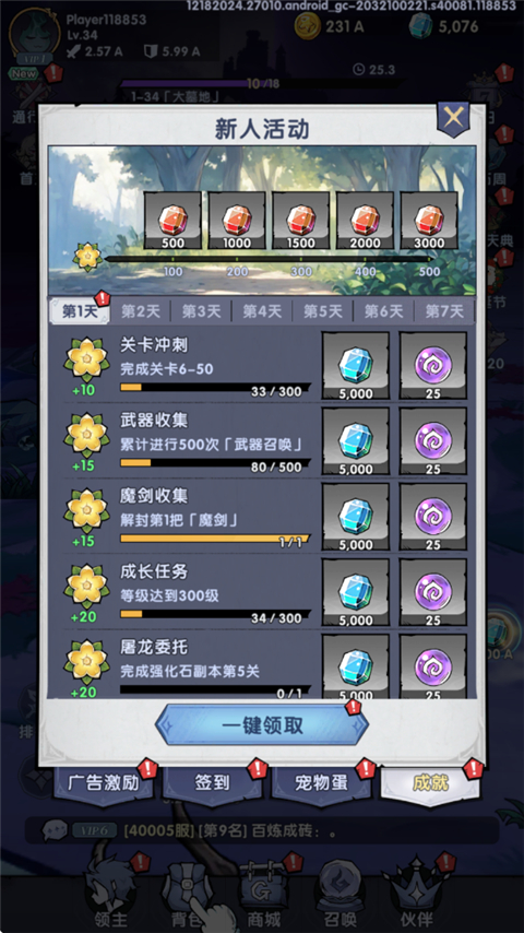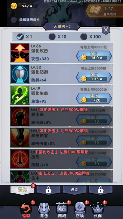 2、成长-升级:天赋点可通过蓝钻重置,因此有两种流派可供选择。攻击流适合推图和打副本,优先提升攻击力和暴击伤害,其次是掉落率;效益流适合离线和刷关卡,优先提升宝箱掉落几率,其次是攻击力。