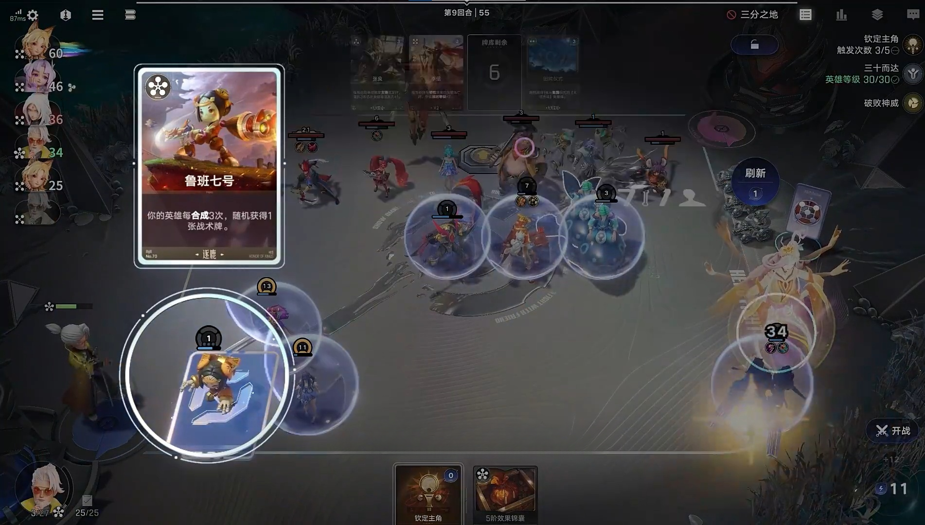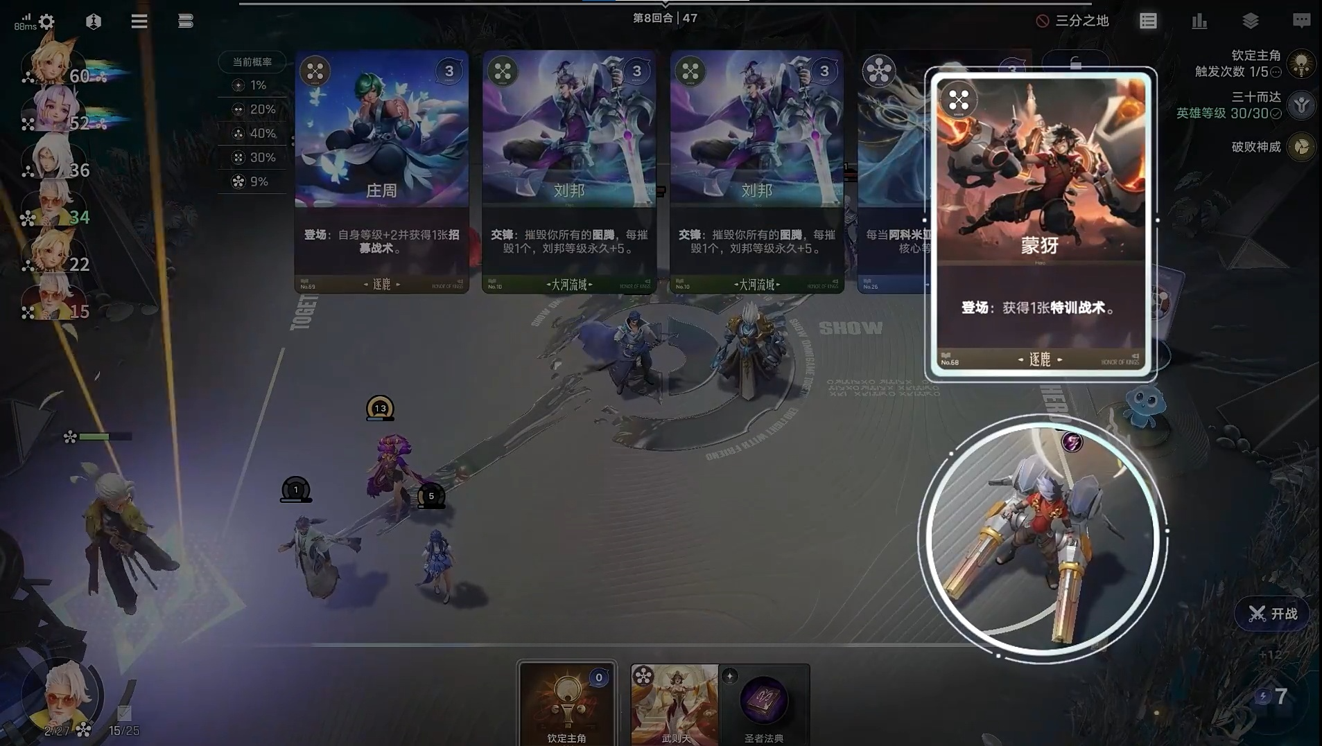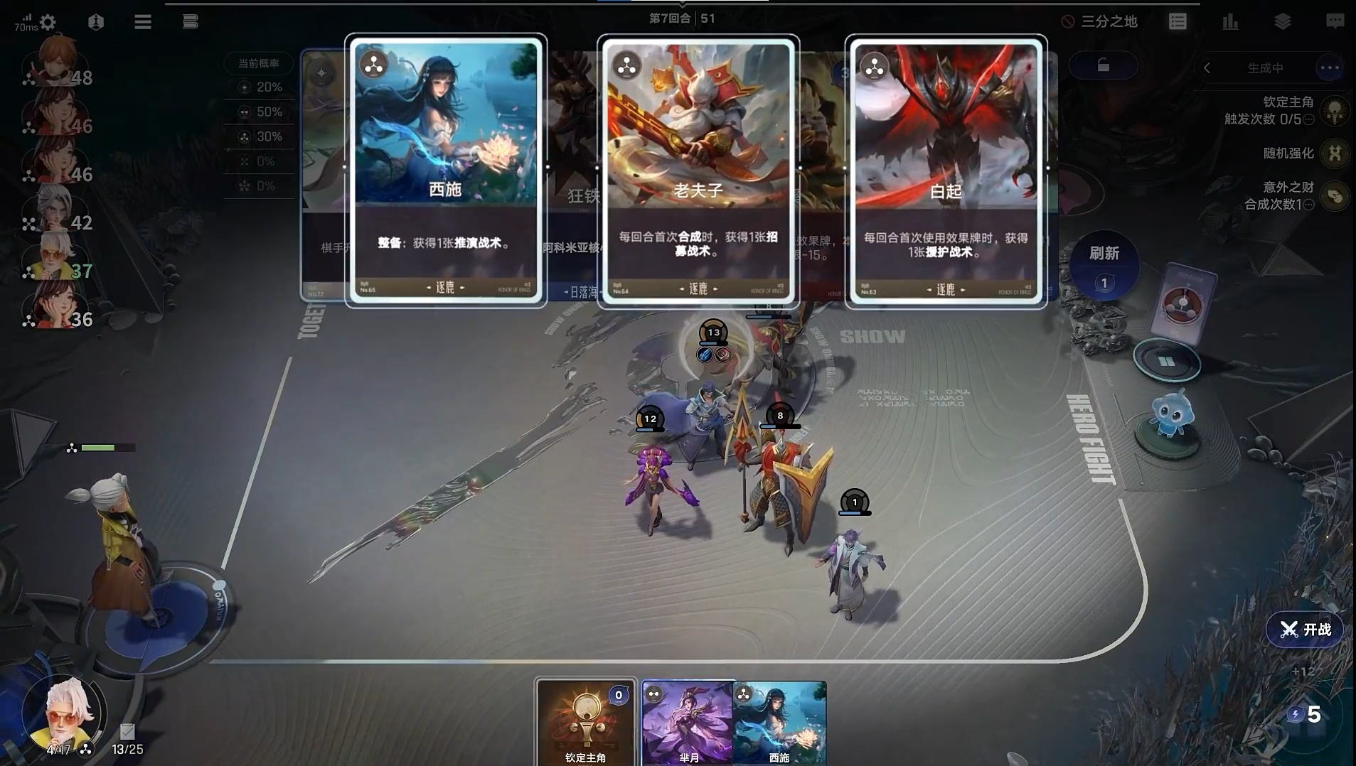 5、在第四回合左右,将棋手等级提升到3级。这时候我们可以开始搜寻,阵容的中坚力量,西施、老夫子和白起,为后续培养核心输出英雄做准备。