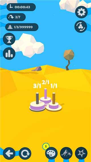 2、进入游戏后,我们可以看到三根木桩,在木桩的上面有着三个圆柱体,玩家只要将它从大到小的依次放在相同颜色的木桩即可完成挑战;